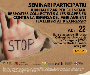 El proper 22 d'abril de 2026, l'Il·lustre Col·legi de l'Advocacia de Tarragona serà l'escenari del seminari participatiu «Judicialitzar per silenciar: respostes col·lectives a les SLAPP en contra la defensa del medi ambient i la llibertat d'expressió».