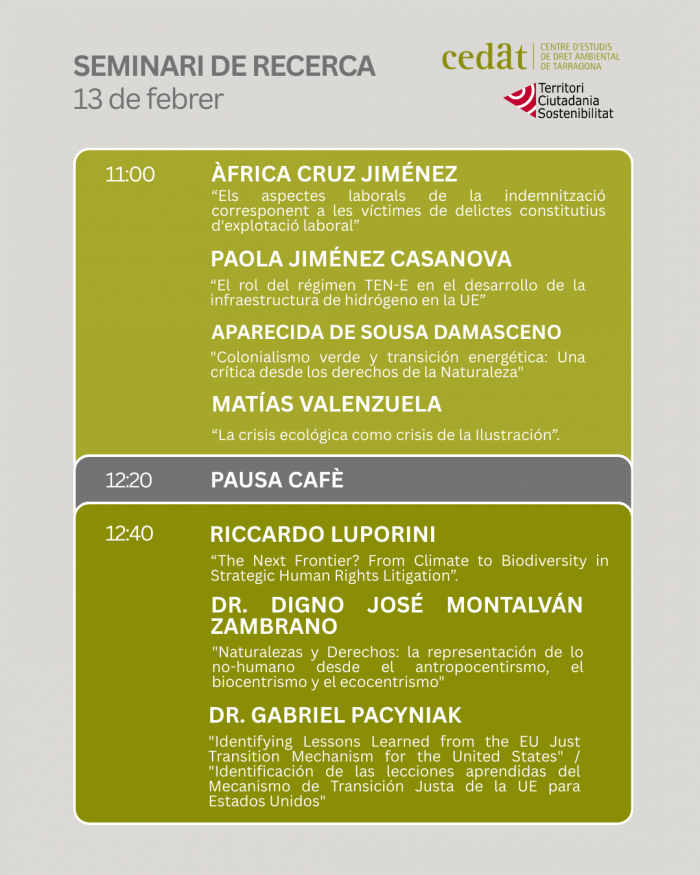 El divendres 13 de febrer, de 11.00 a 13.30 h, tindrà lloc un Seminari de recerca a la Sala de Juntes del Campus Catalunya de la Universitat Rovira i Virgili, que reunirà personal investigador predoctoral i postdoctoral per presentar i debatre recerques en curs en l'àmbit del dret, la transició energètica i els drets de la natura.