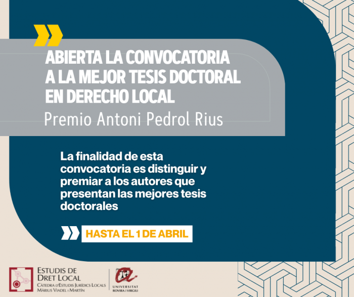 La Cátedra de Estudios Jurídicos Locales Màrius Viadel i Martín, conjuntamente con la Facultad de Ciencias Jurídicas de la Universidad Rovira i Virgili (URV), con la colaboración de la Diputación de Tarragona, convocan la VIII edición del Premio Antoni Pedrol i Rius a la mejor Tesis Doctoral en Derecho Local (2025).
